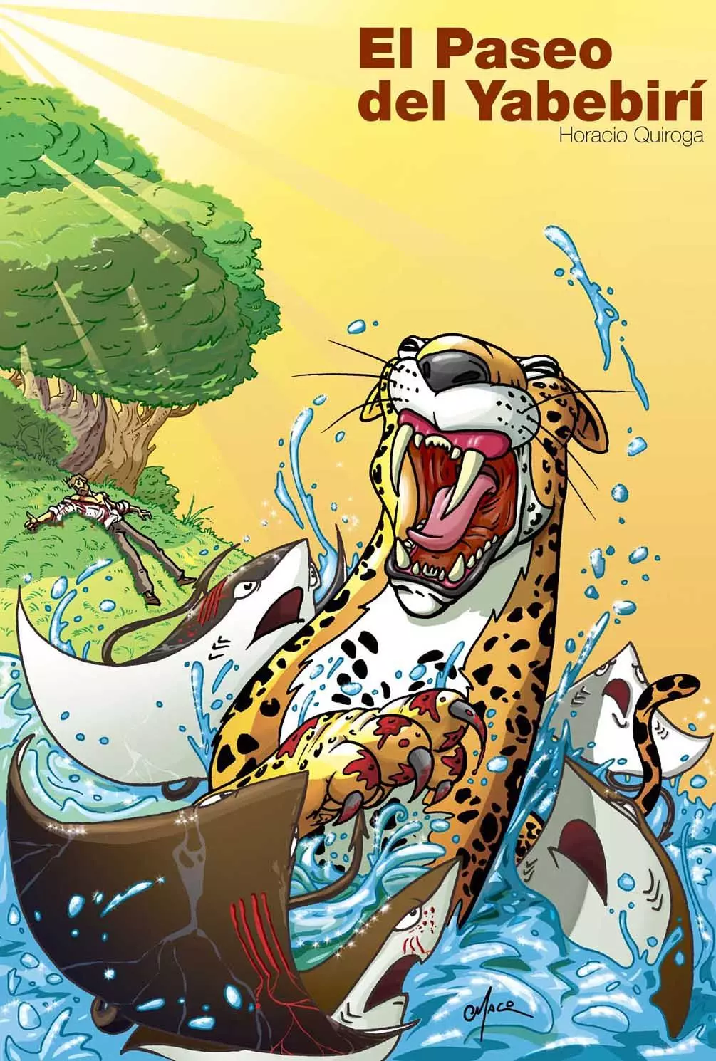 El rugido del tigre hizo que las rayas brincaran en el agua, y se lanzaron como una flecha a la orilla. En efecto, el tigre que había peleado con el hombre, lo venía persiguiendo y había llegado a la costa del Yabebirí. El animal también estaba muy herido y ensangrentado, pero al ver al hombre caído como muerto en la isla, se lanzó al agua para acabar de matarlo.